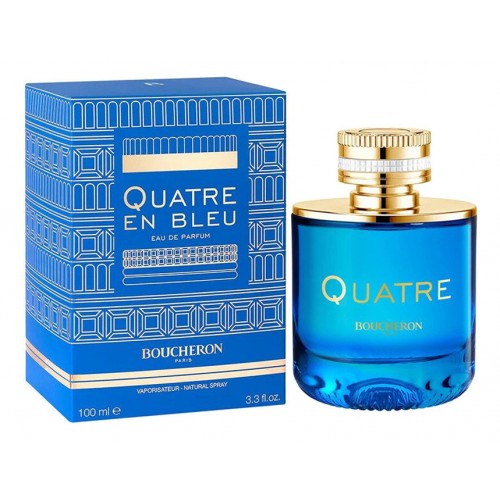 Quatre En Bleu — утонченный и стильный женский цветочный аромат с мягким древесно-мускусным послевкусием, выпущенный в 2021 году французским ювелирным брендом Boucheron. Своим выходом аромат расширил линейку парфюмов Quatre, вдохновленную знаменитыми браслетами бренда. Ярко-голубой оттенок флакона подчеркивает безупречный стиль заключенного в нем парфюма. Звучание ароматической композиции начинается с яркой прохлады цитрусовых нот и нежного пряного аромата туберозы. В сердечном аккорде парфюм обогащается бархатисто-медовым ароматом розы и терпковатыми нотами жасмина. Тогда как база композиции Boucheron Quatre En Bleu сплетает в долгий и невероятно красивый ароматический шлейф бархатисто-сливочные ноты сандала, древесные оттеки молекулы кигалвуд и нежнейший мускус.