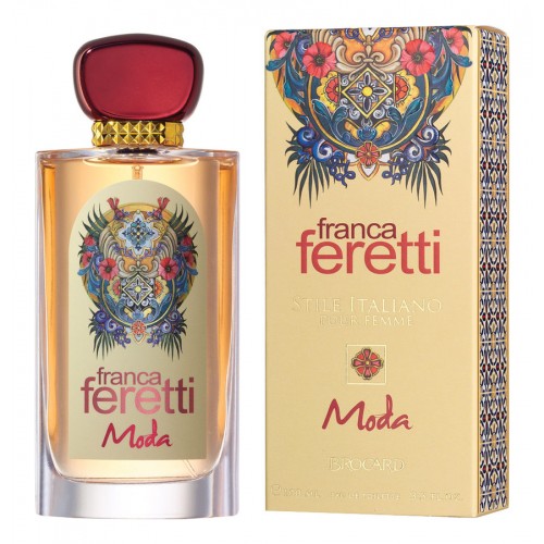 Moda — яркий, самобытный и стильный цветочно-фруктовый женский парфюм с тонкими гурманскими акцентами, выпущенный российским парфюмерным брендом Brocard в рамках коллекции Franca Feretti. Аромат вдохновлен модой, создаёт настроение для игры и напоминает, что собственный образ — это поле для бесконечного творчества. Ароматическая композиция открывается взрывной волной сладких красных фруктов, освежающим цитрусовым запахом мандарина и бархатисто-медовым ароматом спелого персика. Яркие ароматические краски вступительного аккорда словно позаимствованы у итальянского лета. Они прогоняют холод и северную мглу, озаряя мир южным солнцем и неизменно взывая улыбку. Сердце композиции соединяет в себе ароматы белых цветов — пьянящего жасмина и утонченного флердоранжа — символа любви и привлекательности. Нежная сладость лакрицы придает аккорду некую остроту, показывая притягательный и в то же время своенравный характер хозяйки парфюма. А завершает композицию благородный древесно-ванильный шлейф с едва уловимым тоном пралине, создающий тёплое, лучистое сияние, в котором сложно остаться незамеченной.