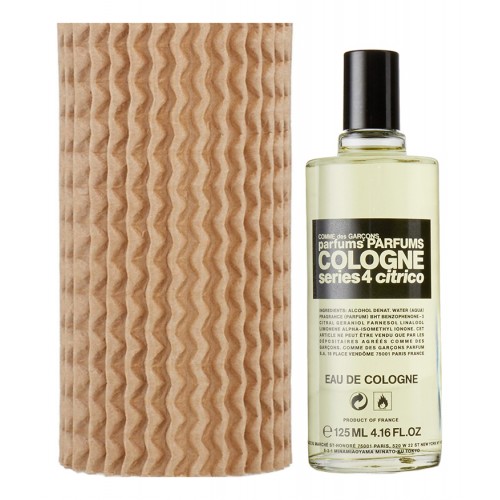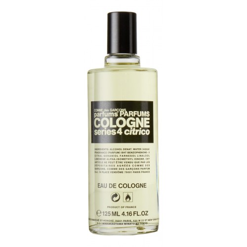 Comme des Garcons Series 4 Cologne: Citrico («Ком де Гарсон. Серия 4 Одеколон: Цитрико») - аромат для мужчин и женщин от французского дома моды Comme des Garcons. Эта парфюмерная композиция была выпущена в 2002 году и вошла в семейство ароматов цитрусовые фужерные. Несущий в себе искрящуюся цитрусовую свежесть, аромат Comme des Garcons Series 4 Cologne: Citrico от Comme des Garcons идеально подчеркнет вашу индивидуальность в самый разгар жаркого летнего дня.Также в коллекцию одеколонов этого бренда вошел аромат Comme Des Garcons Series 4 Cologne: Vettiveru.Парфюмерная композиция Comme des Garcons Series 4 Cologne: Citrico соткана из нот пряного розмарина, живого ириса, бархатного мускуса, темпераментной нероли, энергичного бергамота, пленительной розы, свежего цветка лимона, горького апельсина и освежающего лимона.
