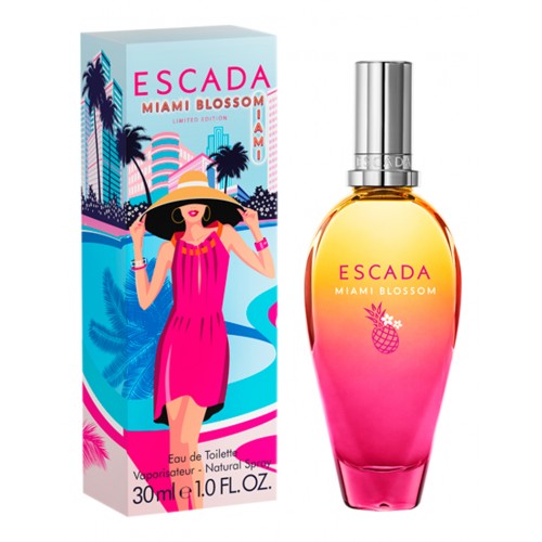 Miami Blossom — элитная туалетная вода с цветочно-фруктовым ароматом для женщин, созданная в 2019 году парфюмером Caroline Sabas для германского бренда Escada. Красочный, жгучий и соблазнительный летний ароматический коктейль, вдохновлен соблазнительным гламуром города Майами — одного из лучших курортов мира. Оригинальный, брызжущий весельем, шипучий микс открывается сладкими вкусными нотами арбуза, черники и сладкого освежающего солнечного апельсина. «Сердце» парфюмерной композиции насыщено роскошным цветочным букетом медовой туберозы и белого изысканного жасмина с экзотическим ярким акцентом сочного сладкого ананаса. Великолепный, притягательный шлейф аромата Escada Miami Blossom соткан из чувственных мускусных оттенков, амброво-древесных нот молекулы амброксана и мягкого, сливочного запаха эфирного масла древесины сандала.
