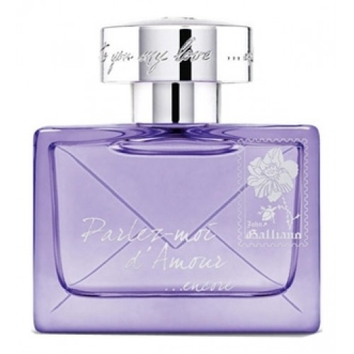 Parlez-Moi d'Amour Encore - новый аромат для женщин от известного французского дома моды John Galliano. Парфюмерная композиция Parlez-Moi d'Amour Encore от John Galliano («Расскажи мне о любви еще раз» от Джон Гальяно) была создана в 2012 году и вошла в группу ароматов цветочные фруктовые. Автор букета - парфюмер Alienor Massenet. Аромат идеально подойдет для повседневного использования и романтических свиданий - это легкий, молодежный парфюм.Также для юных, грациозных барышень мы предлагаем парфюм Belle D Avril от Fragonard.Парфюмерная композиция Parlez-Moi d'Amour Encore от John Galliano открывается верхними нотами сладкого мандарина, ароматной черники и страстной мякоти сочной сливы мирабель, которые, спустя время, дополняются благоуханиями пленительной розы, живого и утонченного ириса и фруктово-карамельной гардении в «сердце» букета. К концу дня композицию дополнит долгоиграющий шлейф базовых аккордов: землисто-древесного листа пачули, чувственного сандала и вечнозеленого кипариса.