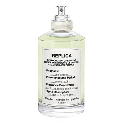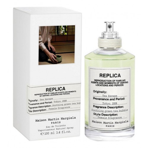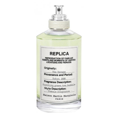 Французский бренд Maison Martin Margiela выпустил в составе своей Replica Collection женский аромат Tea Escape в 2014 г. Автором цветочной зеленой композиции выступил Fabrice Pellegrin. Вдохновением для создания утонченного букета стало путешествие парфюмера по Японии. Многовековая чайная церемония, наполненная тонким символизмом и пьянящим благоуханием зеленого чая, отражена в элегантном аромате. Освежающее и пикантное начало Tea Escape деликатно смягчается изысканными цветочными аккордами, чтобы явить миру головокружительное благоухание чайного листа. Воздушные аккорды риса придают композиции неуловимую легкость и грациозность. Композиция: розовый перец, бергамот, жасмин, зеленый чай, османтус, рис.