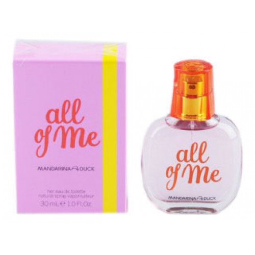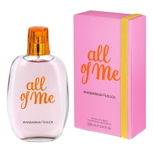 All of Me for Her - ароматная новинка для молодых женщин от испанского дома мод Mandarina Duck. Игривый аромат All of Me for Her от Mandarina Duck («Всё обо мне для Нее» от Мандарина Дак) был создан в 2012 году и входит в группу ароматов шипровые фруктовые.Аромат идеален для повседневного использования, он достаточно легок, но не отанется незамеченным и недооцененным ни мужчинами ни женщинами.Также для молодых женщин, любящих ненавязчивые и кокетливые композиции, мы можем предложить аромат CHE Pour Elle от Chevignon.Композиция парфюма All of Me for Her открывается головными нотами жизнерадостного мандарина, сочного ананаса и сахарной малины, которые затем дополняются благоуханиями спелой клубники, нежного жасмина и деликатной фиалки в «сердце» букета. В завершении композицию дополнит приятный шлейф базовых аккордов: чувственного мускуса, смолисто-древесного листа пачули и сладких конфет пралине.