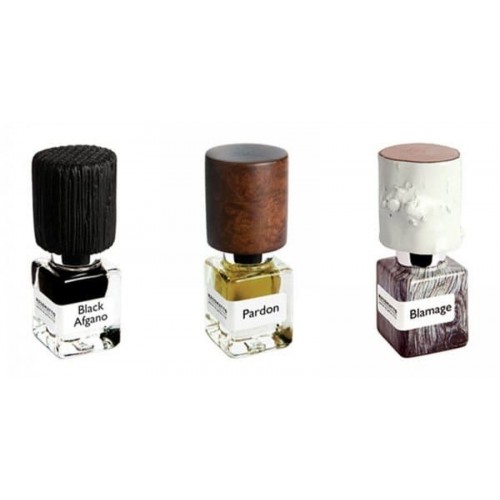 В набор Nasomatto Nas входят: Black Afgano — древесно-фужерный унисекс-парфюм. Верхние ноты: конопля и зеленые ноты; средние ноты: cмолы, древесные ноты, табак и кофе; базовые ноты: уд и ладан. Pardon — древесно-цветочный, гурманский унисекс-аромат. Верхние ноты: магнолия и цветочные ноты; средние ноты: темный шоколад, бобы тонка и корица; базовые ноты: уд и сандал. Blamage — древесно-мускусный аромат для мужчин и женщин. Ноты: мускус, береза, светлое дерево и кожа.
