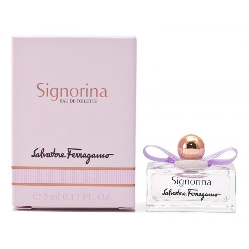 Новый аромат Signorina Eau de Toilette («Синьорина. Туалетная вода») стал олицетворением прекрасной молодой девушки. Это отличный букет для романтичных натур. Он не лишен чувственности и выражает ее через природную элегантность, он свежий и соблазнительный. Парфюмерная композиция относится к цветочно-фруктовым запахам. Парфюм создан в 2013 году парфюмерами Sophie Labbe и Juliette Karagueuzoglou.Новинка стала обновленной и еще более нежной версией оригинального аромата Signorina.В верхних нотах аромата Signorina Salvatore Ferragamo присутствует розовый перец и красная смородина, на смену которым приходит аромат нежного жасмина, розы и пиона, завершают композицию ноты мускуса, пачули и панна-котта.